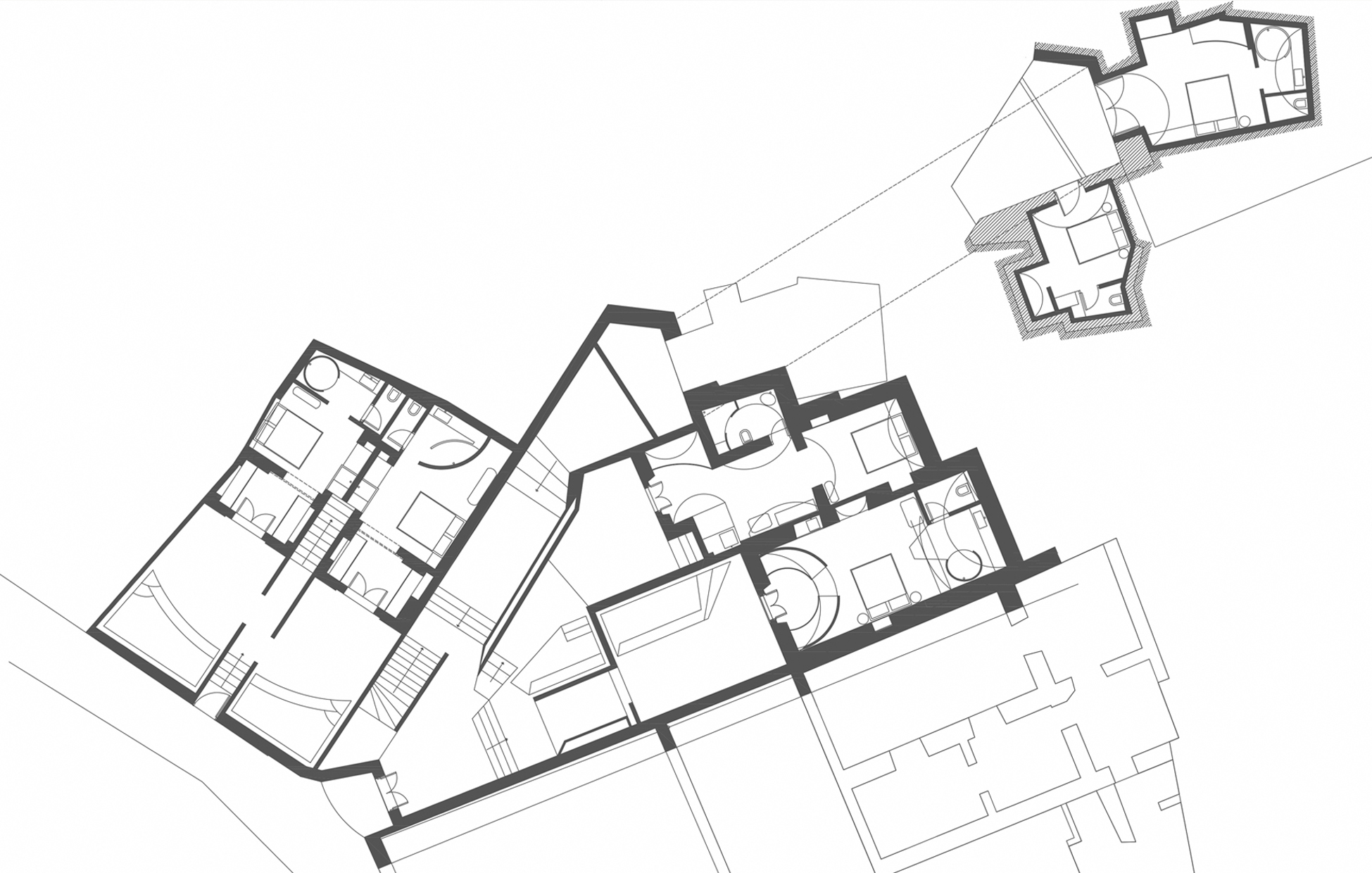 Despite the fragmentation of surfaces and boundaries, the space gives a sense of protection and intimacy. The high, sloping levels enhance privacy and define zones with surprising softness. Here, entropy is not violent. It is a gentle dismantling of certainty to allow surprise and discovery.