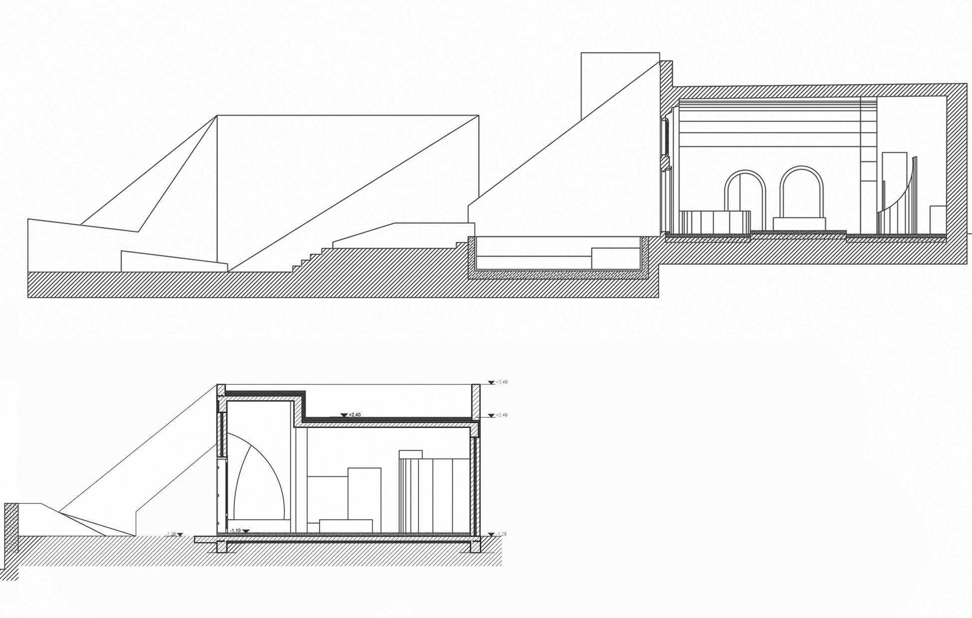 The interior spaces offset the exterior elements through curvatures. These are smooth and although intersecting, they surround a continuous whole. This juxtaposition reveals an architectural intelligence: the interior is not an imitation of the external chaos, but its emotional resolution. The vaulted arches, ancient and sacred forms, ground the work in a deep architectural genealogy
